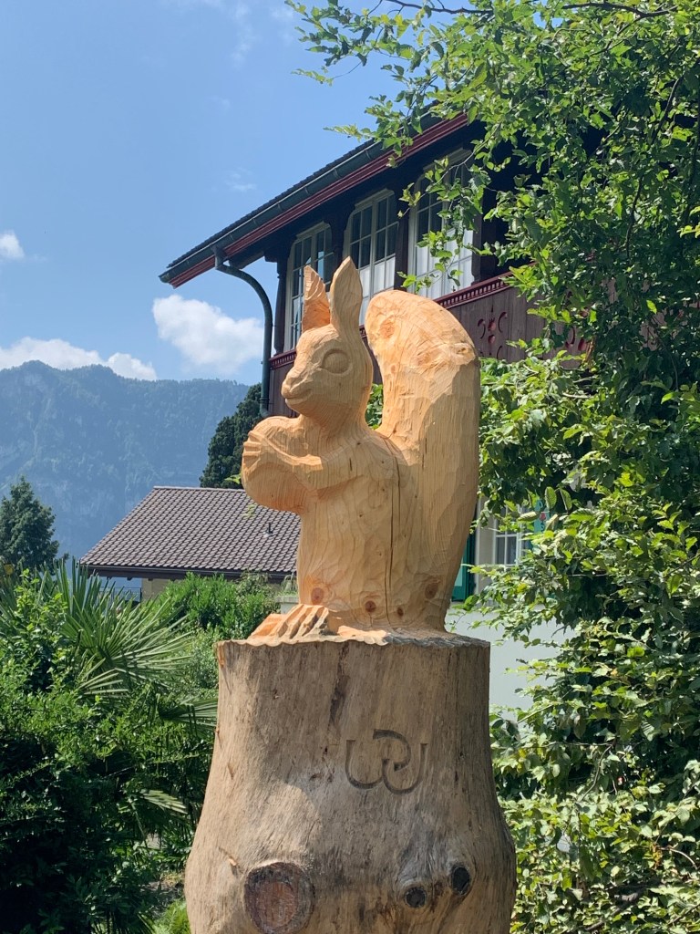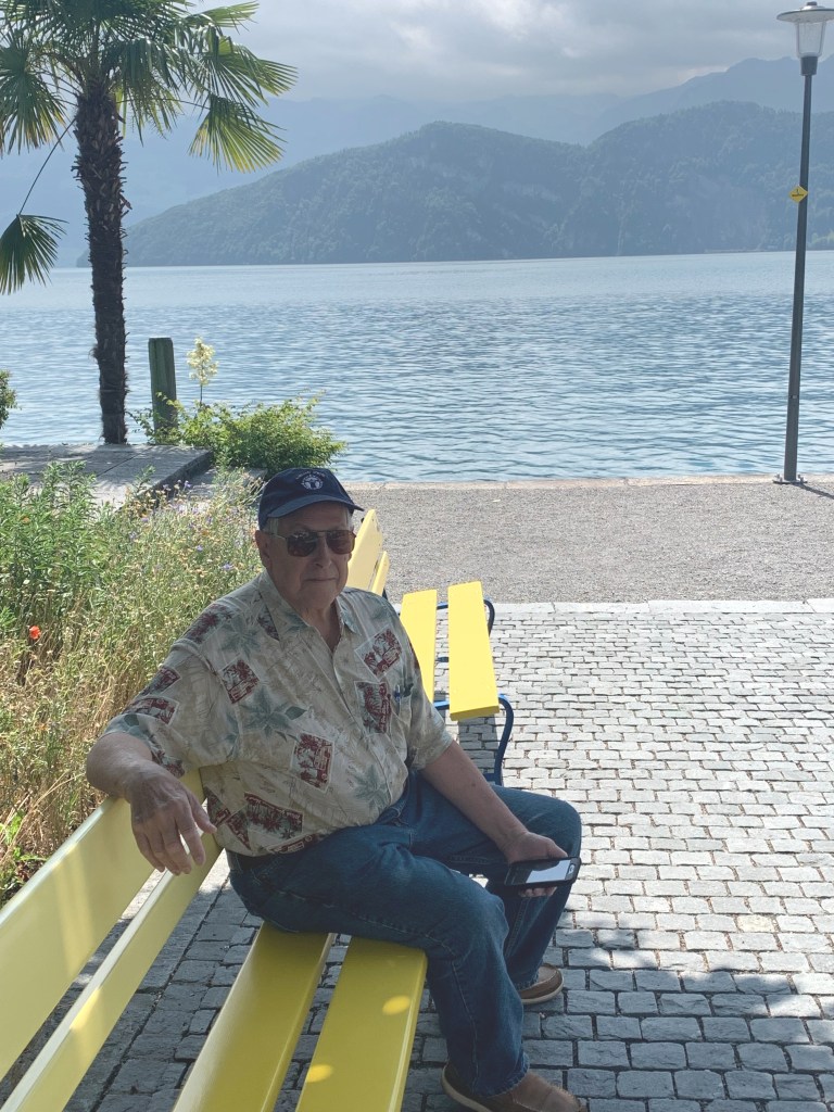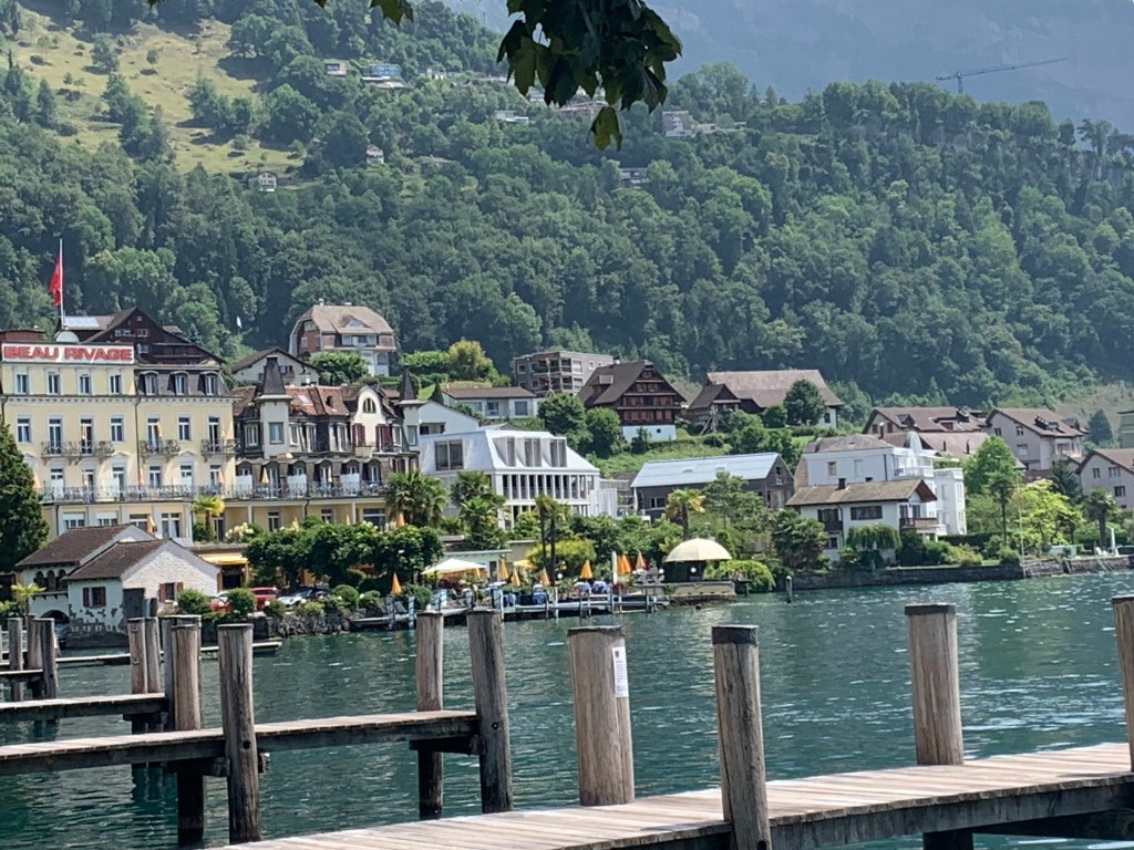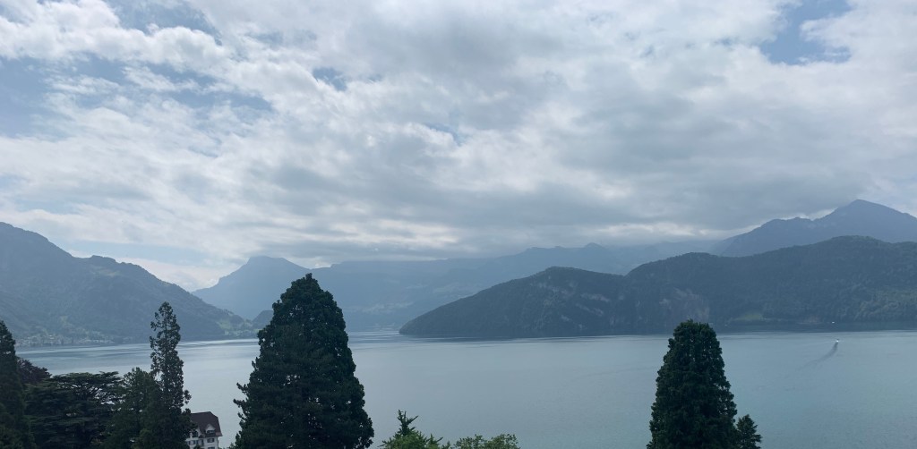 Everything in Weggis was much more expensive than anywhere we had been so far. Coffee with a table at an outdoor café would be over $10 each! We decided to buy waters, and an amazing lemony dessert, from a kiosk in the park and sit on a bench to wait.