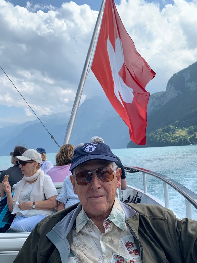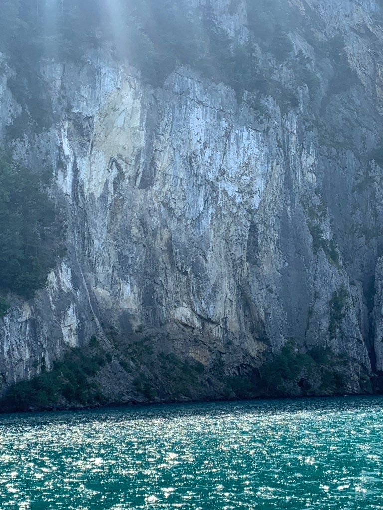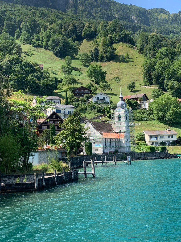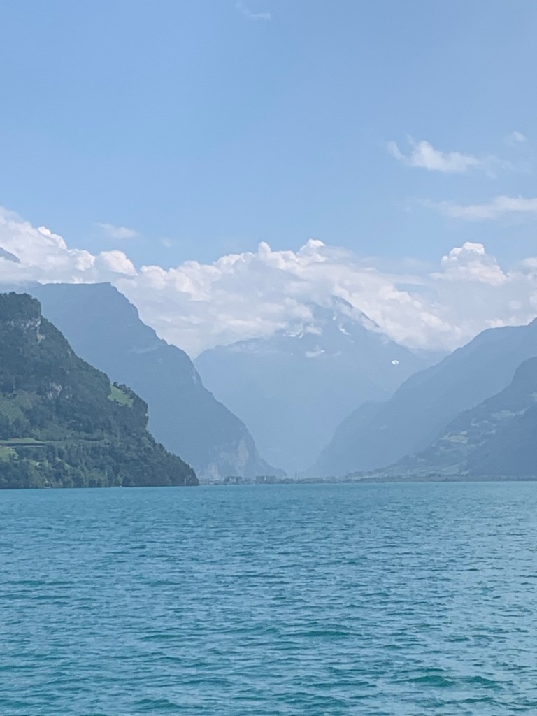 The ship boarded right on time (think Swiss watches) and we found seats first inside at a table, then a better spot outside on a wide bench facing the east side of the lake. We would have the western view on the way back. The ship was only about half full, so there was plenty of room and people moved around easily. Everyone seemed relaxed, even locals who were using the ferry just to get from one place to another.