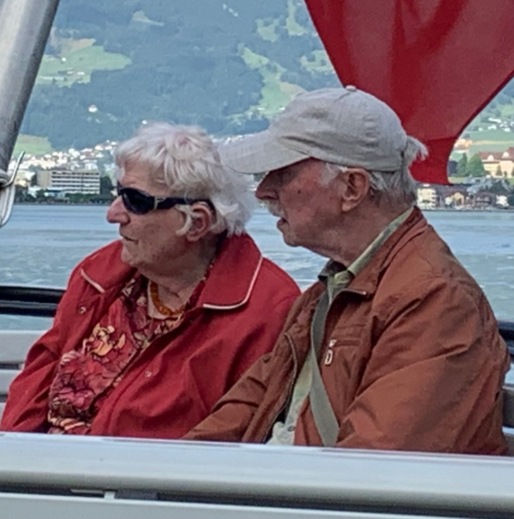 The four hours sailed by as we stopped at villages up and down the lake, passengers getting on and off: hikers with their boots and walking sticks (ironically smoking), teenagers with backpacks, couples young and old, including one older couple who followed one another around the boat, finding a seat for a time, then moving to another. They never walked together. The old man walked stooped over with his mouth open, his shoes never leaving the deck as he shuffled from one foot to the other. He reminded me of Tim Conway’s impression of an old man on the Carol Burnett Show. They always found each other. She was usually the one finding him. But once we saw him shuffling back to her with two ice creams he had purchased from the café.