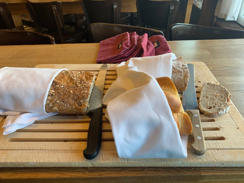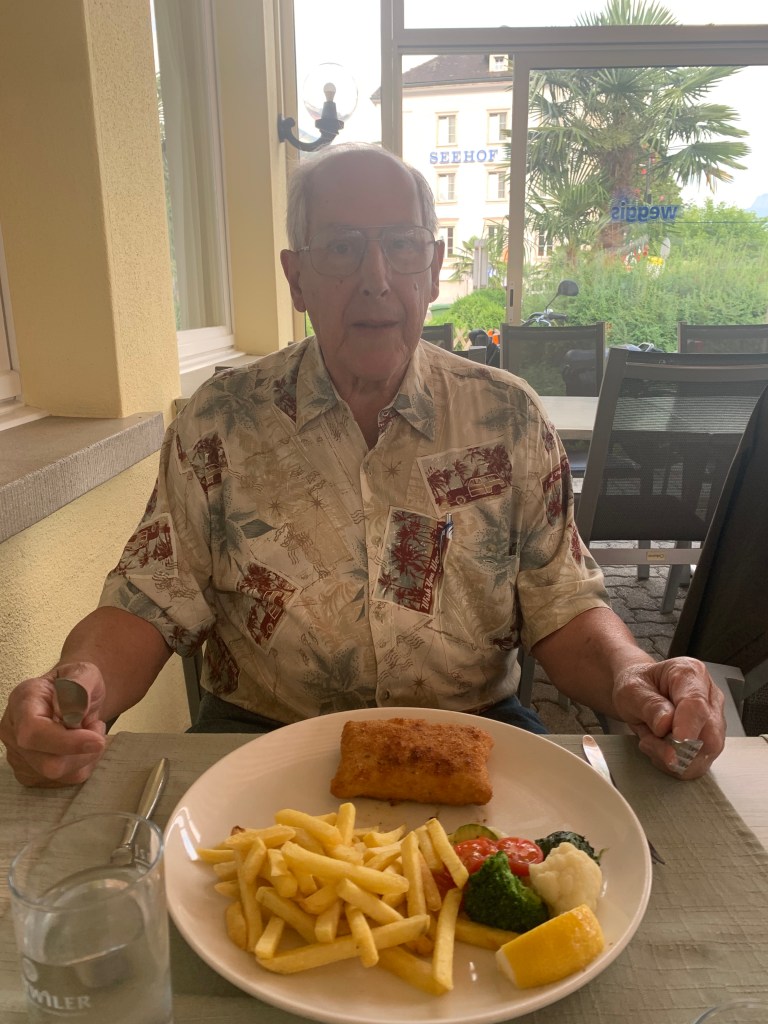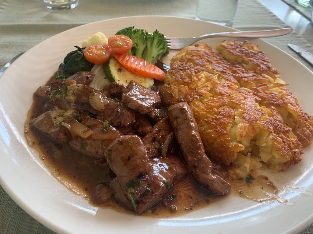 We decided not to eat on the boat since the dessert before we left seemed to be tiding us over. We arrived back at Weggis at 6 p.m. and walked to the Hotel Viktoria, which someone had recommended as a place we could find traditional Swiss food. I had hoped to get fondue or raclette on our one night in Switzerland, but the man at the restaurant told us that these were served only in the winter months; they were not warm weather foods. That made sense! So we stayed at an outdoor table on the lake and ordered pork cordon blue with French fries (Santo) and veal liver with rösti (me).